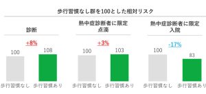 その結果、健康・生活習慣と熱中症の関係について因果関係を意識した多変量解析※2を用いて検証したところ、日常的に歩く習慣がある人は、そうでない人と比較して、熱中症による入院リスクが約17%低いことが確認されました。